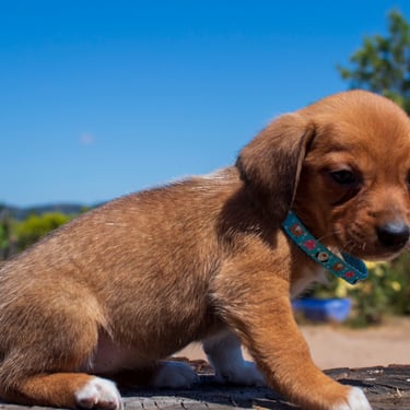 Estado: DisponibleHembra roja con manchas piebald – pelo corto (posible portadora de largo)